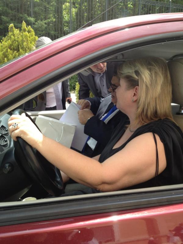 Φορώντας στο αριστερό της χέρι ένα δαχτυλίδι με έναν μαύρο σταυρό, η σύζυγος του Νίκου Μιχαλολιάκου, και βουλευτής της Χρυσής Αυγής Ελένη Ζαρούλια, οδήγησε το αυτοκίνητο με το οποίο έφτασαν μαζί στη Βουλή για τη σημερινή ορκωμοσία.